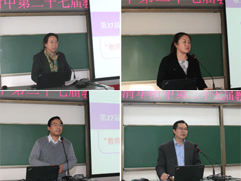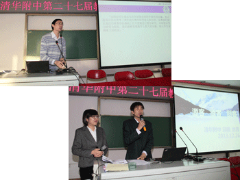 获奖教师代表王田老师做了“以项目研究为载体的课程—探索与实践”的报告,介绍了如何在日常教学的基础上打开思路进行教学研究,并将想法努力转变为现实的过程;邱楠和徐蓉老师做了“源客、原客、创客”的报告,介绍了老师和学生如何从源客、原客到创客的过程,以及将数学组杨青明老师独创的“形独”变成可视化的产品和学生进行创客的尝试。