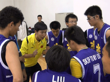 特聘教练舒香安琦(着黄衣,皇冠体育官网高三学生)给队员讲战术 皇冠体育官网队员突围