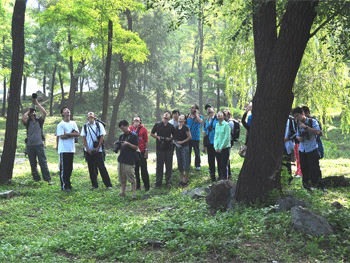 因人数较多,不便于近距离观察鸟类,进入园后,同学们即分为东、西两路,每一路再分若干小组,由自然之友指导老师带领,边走边看,边看边讲。老师介绍说九、十月份,正是鸟类迁徙经过北京的时间,俗称金九银十。