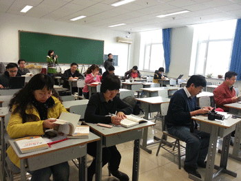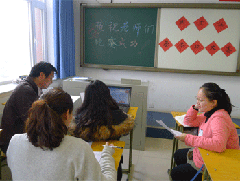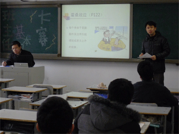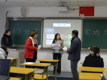 比赛分为两个阶段,第一阶段,选手分组抽签,根据题目进行小组讨论。第二阶段,分两个环节进行比赛,第一环节的题为:“开卷有益”,主要是必读书目《班主任工作中的心理效应》的个人读书心得分享,选手在规定时间内先根据题目出示的心理效应名称进行专业解读,简要介绍与该案例相关的心理效应,然后结合自己的理解谈如何在班主任工作中运用这一效应收到良好的教育效果。选手们充满自信的解读和智慧的应用让所有听众为之赞叹。第二环节的题为:“集思广益”,主要是通过小组合作,进行教育案例分析。各个小组针对案例中的问题,经过层层深入的分析、讨论提出了多个角度的解决方案并在小组汇报中用不同形式的展现出来:表述、情景剧、相声、歌曲演唱……考场中不时传出热烈的掌声和阵阵欢笑声。