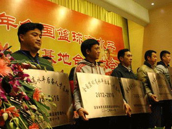 马班办公室主任罗健(左1)代表学校受牌 全国篮球高水平后备人才基地牌子