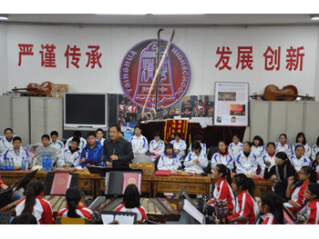 北京科技大学艺教中心主任韩学周(指挥台就坐者)指导来访的林景中学乐团学生(右)