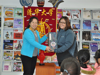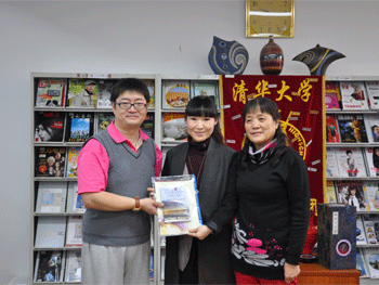 胡军主任(左1)向郑州回民中学民乐团主任张耀之(中)赠送纪念品(左)