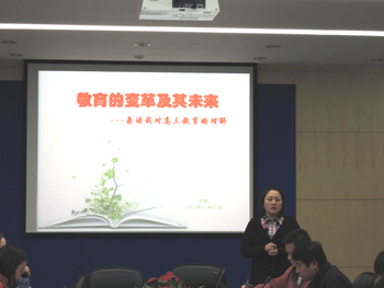 方妍书记发表了题为《教育的变革及其未来》的演讲。她从时代的高度纵谈了基础教育的发展形势,特别强调在当今这样知识爆炸的时代,应该把培养学生的独立思考和综合判断能力放在首位。而要达到这个目的,教师就需要改变,需要充实,需要与时俱进。方书记的演讲结合视频,震撼人心,给老师们解决高三教育教学问题提供了新思路。
