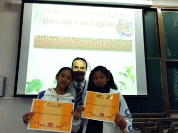陈建荣老师(左2)正在裁判胜出班级 外教Tim(中)为获奖班级颁奖
