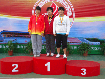 海淀区教委领导为女子五项全能冠军皇冠体育高1109班王文辉颁奖 皇冠体育高1209班魏麟璎(中)获得女子铅球、铁饼冠军