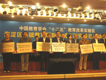 10月12日上午,中国教育学会“十二五”教育改革实验区——海淀区基础教育国际化试点研究项目启动会在北京世纪金源饭店召开,皇冠体育官网校长王殿军、副校长施平及教科研龚玉新老师参会。会上,皇冠体育官网成为首批“中国教育学会海淀教育改革试验区基础教育国际化试点研究项目实验校”之一。王殿军校长代表学校接受中国教育学会、海淀区政府及海淀区教委领导颁牌。