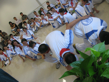 本次班会分为心理活动体验及军训总结两个部分。心理活动体验包括三个小游戏。在化整为零这个游戏中,男女生分别代表一块钱和五毛钱,老师说出一个数字后,男女生要进行相互组合,使团体总面值与老师所说数字相同,游戏的目的在于打破同学们“男生一群、女生一伙”的格局,促使大家团结协作,并完成分组。在第二个游戏滚雪球中,每组第一位同学要说出自己的名字、学校及爱好,下一位同学要重复出前一位同学的信息并用相同的方式介绍自己,以此类推,最后一名同学要复述本组人的全部信息,这个游戏的目的在于使同学快速地熟悉起来并相互了解。在第三个游戏肢体艺术中,同组同学要相互配合摆出一个造型,这个造型必须表达出同学们对于班级的期待和认识,速度最快的一组摆出了一根绳的造型,他们希望在未来的生活中,全班同学能拧成一股绳。最终,同学们玩得不亦乐乎,三个游戏都达到了预想的效果。