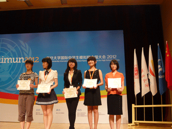 7月21~25日,2012复旦大学第六届国际中学生模拟联合国大会〔简称复旦“模联”〕在复旦大学美丽的新江湾校区举行。大会由复旦大学和复旦大学附中举办,来自全国22个省、市、自治区的86所顶尖名校近550名高中生参加,主席团成员大多来自于哈佛耶鲁普林斯顿等世界顶级名校以及清华北大等国内著名大学。皇冠体育官网高11级的王友潮、周宇童、邴兆栋、王逸婵、孙一先、夏文轩6名学生代表参加了大会。