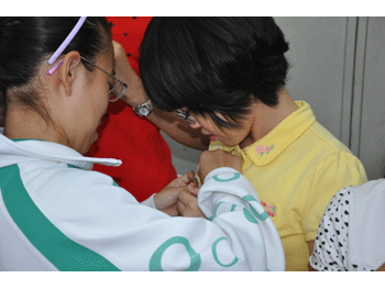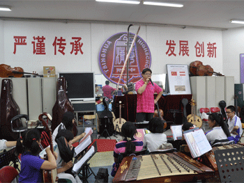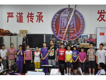 乐团办公室陈克老师对新生提要求 老队员为新队员佩戴附中金帆民乐团的胸牌