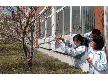 学生为校园植物挂说明牌 孙玉梅老师(右)组织设计为校园植物挂说明牌活动