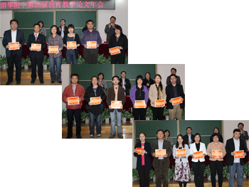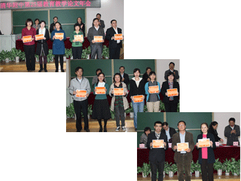 方妍书记宣布获奖名单(左上);王殿军校长总结发言 校领导为年会论文获奖教师代表颁奖