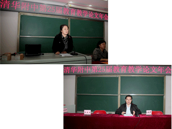 校领导为年会论文获奖教师代表颁奖 孟卫东主任做汇报(左上);获奖者代表白 建娥(右上)、崔琪(左下)、邱道学发言