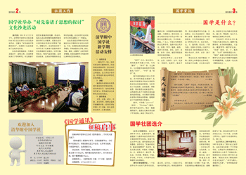 《国学通讯》开辟了“社团工作”、“国学资讯”、“知识天地”等版块,今后将不定期出刊,积极反映社团工作动态和社员学习成果,介绍国学知识,弘扬民族文化。
