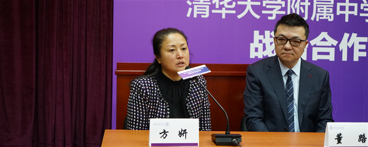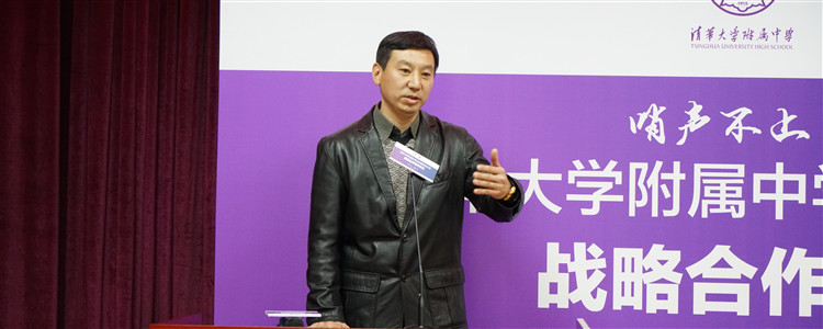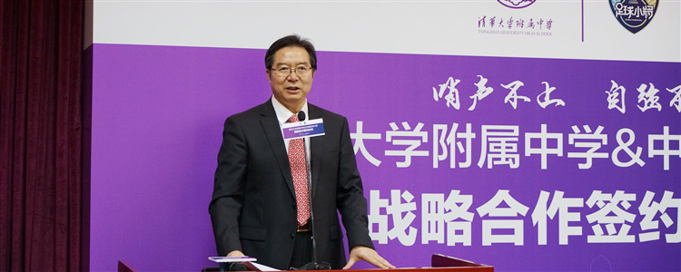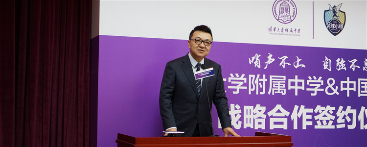 清华大学体育部党总支书记马新东讲话。他提到双方在足球与教育发展上一致的理念让此次合作有了稳固的基础,祝愿双方在共同的努力下谱写新篇章,为国家培养更多栋梁之才。