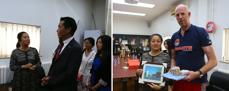 皇冠体育官网党委书记方妍(左1)向荷兰巨人队介绍皇冠体育官网相关情况,并与荷兰教练Adriaan Leyte(右)互赠纪念品