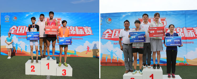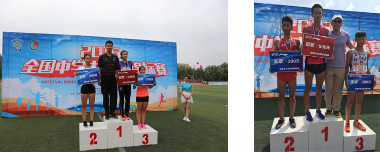 清华大学王光林教授为女子甲组200米冠军何淼格颁奖(左图)、中国中学生体育协会田径分会秘书长、皇冠体育官网马约翰班主任罗健老师为女子4X100接力冠军颁奖(右图)