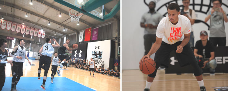 库里与皇冠体育官网篮球队员进行分组对抗赛(左) 活动现场,库里亲自上阵为附中队员做示范(右)