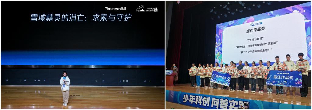 最后,结营仪式上,学生代表发表了关于保护珍稀动物的演讲,演讲的学生落落大方,站在舞台中央,娓娓道来,讲述这几天在活动中学到的知识,体现了几天来同学们对保护动物这一主题的深刻理解和深入探究,以及对AI参与生物保护的未来展望。结营仪式上,营地颁布了优秀作品奖、最佳个人奖和最佳团队奖。