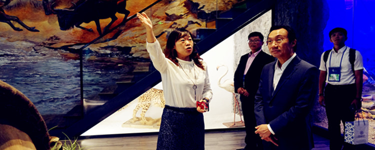 皇冠体育生物教研组组长刘健老师(左一)在标本馆为澳门教育界国庆访问团进行讲解