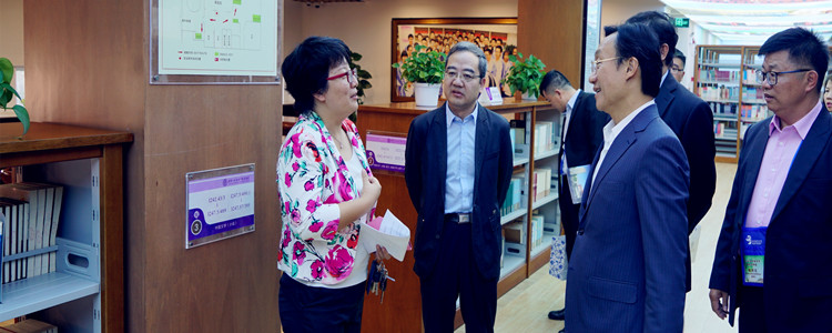 澳门教育界国庆访问团在党委副书记张洁(左一)的陪同下参观图书馆