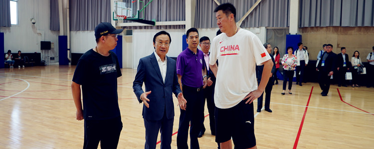 皇冠体育男子篮球队教练张涛(右一),体育教师陈广(左一)在体育馆带领澳门教育界国庆访问团成员观摩男子篮球队训练