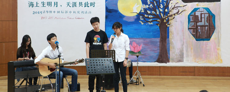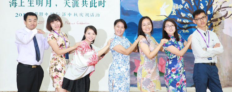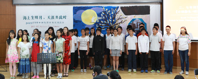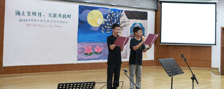 其后作为诗会的升华及点睛之笔,活动还播放了一组感人至深的视频剪辑。从懵懂孩童对于中秋的可爱理解,到在校外教对于中秋的好奇及感恩节式联想;从海外学生对国际部、昔日同窗和北京的深深怀念,到离职外教对国际部师生的祝福及怀想,再到全体中文老师对于THIS大家庭成员的中秋祝福,整组视频循序渐进地展现了THIS大家庭成员对于中国传统节日中秋的认识和理解,并在这种探求之后更深地融入THIS大家庭,认同与皈依了中秋的团圆文化。最后作为诗会的体验部分,全体师生及家长在《花好月圆夜》的美好歌声中,以homeroom为单位分享了象征着团圆与幸福的中秋大月饼,诗会的祝福与团圆至此合上了美满的画卷。
