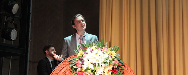接下来是毕业典礼的主题发言人Tyler Shelden上台演讲。他担任国际部数学教师、“模拟联合国”指导教师,组织了各种课内外及社团活动。在演讲中他回顾毕业生的在校生活的点点滴滴,追溯了清华大学“中西合璧”的历史及传统,并鼓励学生在新的大学生活中融入多元文化环境。