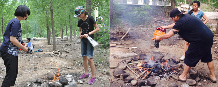 早上八点十五分,师生整装出发,经过两个小时的车程到达神堂峪的模拟野营集训地。随行的五位中外老师分设五个主题站点,每九个学生一组,在每个站点分别进行20分钟的集训。集训主题包括:如何点燃篝火,如何发出紧急求助讯号,怎样进行急救护理,怎样徒手搬运伤患人员,怎样绑绳结。