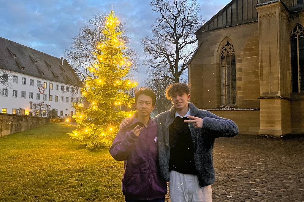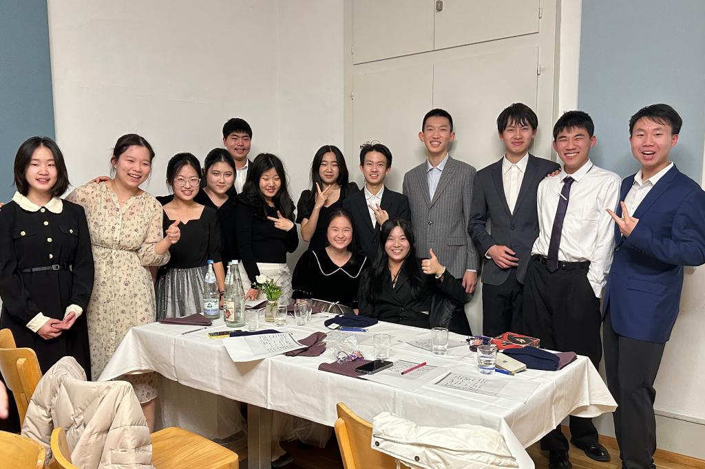 经过十个小时的飞行,跨越八千余公里,皇冠体育官网的老师与同学们终于在德国时间1月25日晚12点抵达了萨勒姆王宫中学。在这里,十四名附中学生跟随着他们各自的伙伴同吃同学。萨勒姆王宫中学的老师为学生们准备了如德语名著阅读课、数学课、以“Bridging the gap”为主题的英语课、历史课、涉及洋流、冰雪反照率反馈效应的地理课、政治课、哲学课、物理及化学实验课、生物课、以及专为我们量身定做的德语入门课等丰富又精彩的课程,极大的激发了同学们探索的求知欲,让他们遨游于知识的海洋。傍晚时分,萨勒姆王宫中学为附中学子举办了欢迎晚宴,附中学生代表王楚源与德国学生代表分别致辞。随后,赵思齐同学演奏小提琴《巴赫第三组曲》片段与中国乐曲《渔舟唱晚》。附中同学们身着礼服,与德国伙伴们欢聚一堂,愉快的交流各自国家的文化习俗、名胜古迹与传统美食。