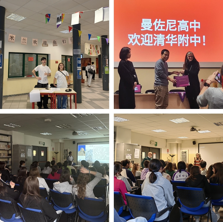 曼佐尼市立语言学校的学生热情欢迎到访的附中师生团、带队教师高一学部主任白传江(左2)向曼佐尼市立语言学校校长埃琳娜•曼恩蒂(右2)赠送礼物、附中学生向意大利伙伴展示中国文化、附中学子与意大利同学一起上课