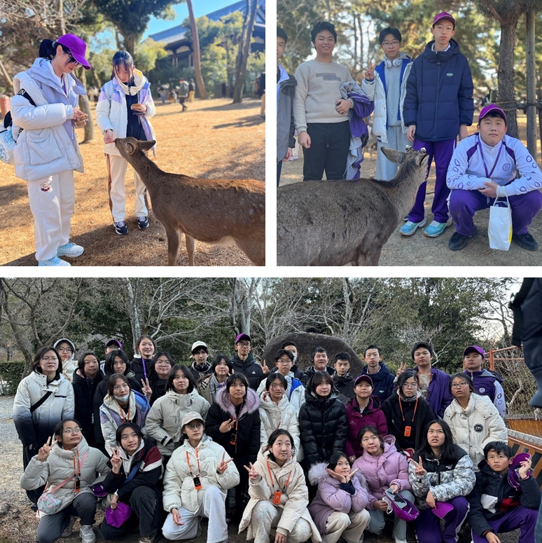 在奈良公园,同学们与小鹿亲密互动,感受到了人与动物的和谐相处;在京都,同学们参观了世界文化遗产金阁寺和岚山周恩来纪念碑;在大阪,同学们游览大阪城公园,登天守阁,了解日本古代建筑的艺术风格和历史价值,在大阪历史博物馆感受大阪的历史与发展。