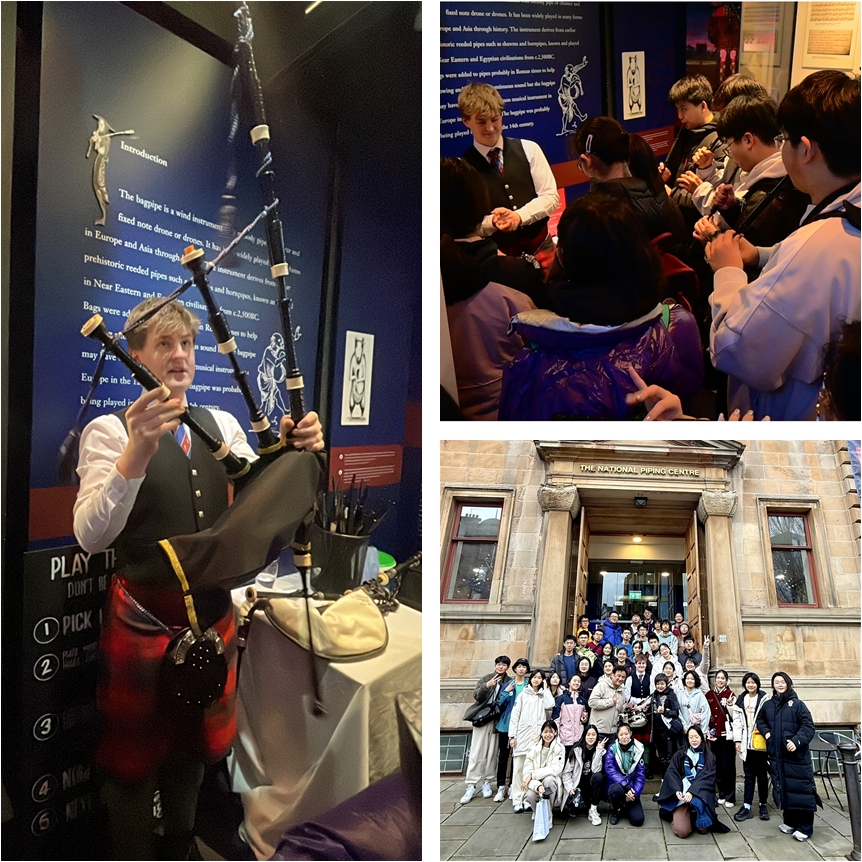 踏入位于格拉斯哥的国家风笛中心,一场与苏格兰民间音乐文化的邂逅就此展开。同学们步入中心内的风笛博物馆,馆内每一件展品,诉说着苏格兰过去300年间传统风笛的发展脉络。从古朴的风笛雏形,到工艺愈发精湛的现代风笛,它们承载着历史的厚重,串联起岁月的记忆,让同学们对风笛的发展有了更为直观而深刻的认知。身着苏格兰民族服饰的老师,热情又耐心地为同学们讲解风笛的构造。在老师的悉心指导下,同学们纷纷上前,尝试奏响这神秘的乐器。尽管是初次接触风笛,大家的动作稍显生疏,但每个人都鼓足了劲,眼神中满是专注与期待。随着一个个音符的响起,风笛那独特而淳朴的音色在体验中心内悠悠回荡,时而低沉悠扬,如诉说着古老的传说;时而高亢嘹亮,似在欢呼胜利的喜悦。这声音,穿透了空间,也穿透了时间,让同学们深深沉浸在苏格兰风笛文化的独特魅力之中。