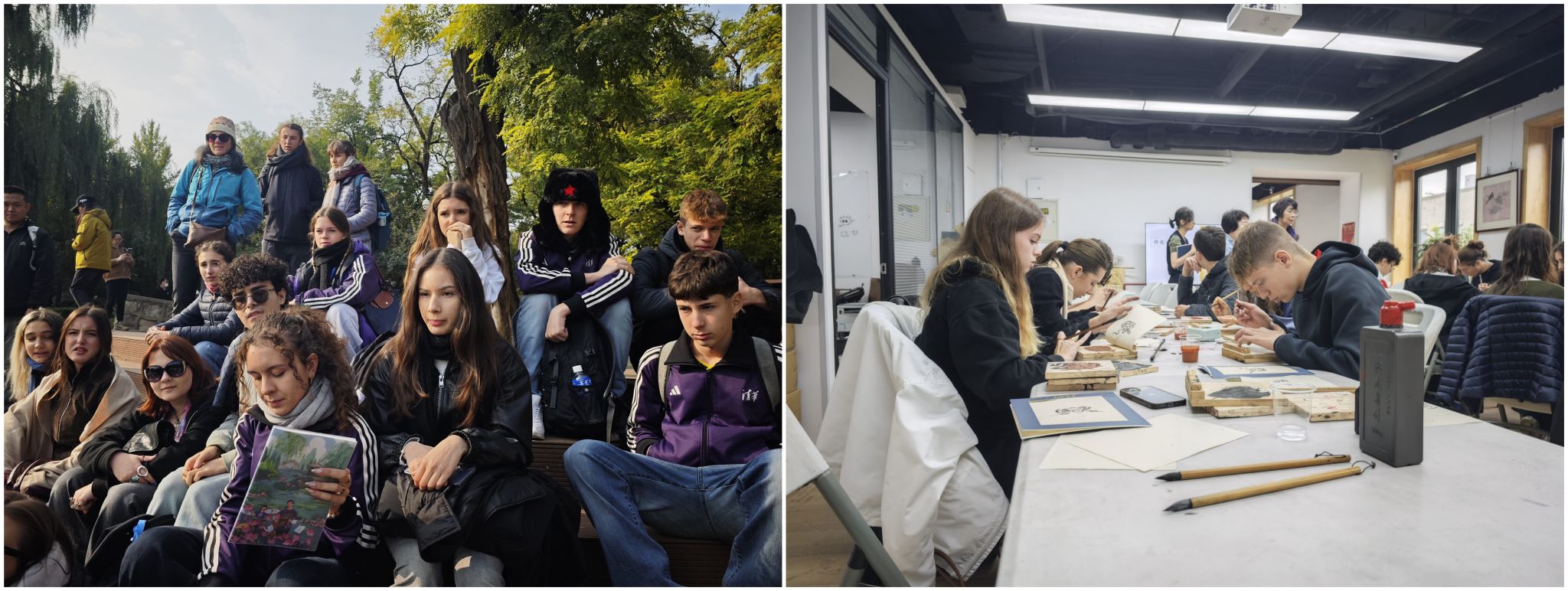 意大利学生在圆明园进行小组学习、在荣宝斋体验版画制作