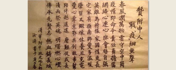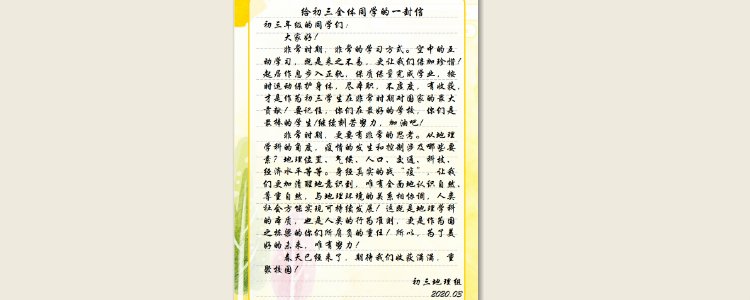 在这两个多月里,我跨头承担了学校高二、高三年级备课组,区里高二年级和高三年级的录课任务。虽然任务很重,但在这个特殊的时刻,我往往能在备课中感受到更多中华民族的生生不息与坚韧不拔;在讲课中更多的传达和引导学生体会这种家国情怀。