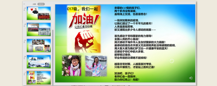 为了帮助初三毕业班的学生们疏导心理,鼓励他们坚持努力,初三地理备课组特意制作了《为C17级加油》的诗朗诵视频。视频中以激动人心的抗疫图片为背景,唐秀梅、高昕两位老师朗诵了唐秀梅老师为学生们精心编写的诗歌。疫情期间,国家高效领导,全国人民众志成城,医务人员全力以赴。希望以此激励学生们为自己的使命努力奋斗。