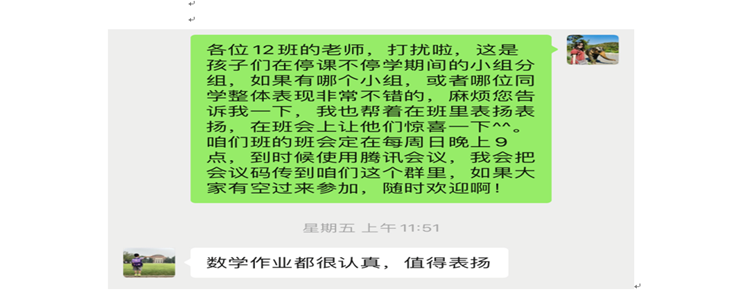 停课不停学,隔离不隔爱。我是皇冠体育班主任队伍中普通的一位,我身边的老师们无一不在以最大的热忱,最真的投入,参与到这场疫情下的线上教育活动中。我们12班的任课老师团队,一直在以工作组的形式开展工作,互相配合,陪伴着学生成长。