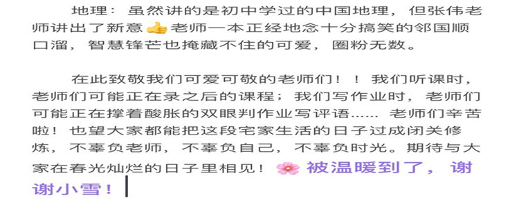 在不停学的日子里,12班每晚都会彼此分享一日的生活点滴,每周都有由学生自行策划的在线直播班会。同学们透过小小的一方屏幕,晒笔记,晒美食,晒花草,晒健身成果,晒读书心得……每当这个时刻,我都感觉到一张张生动活泼的笑脸就出现在我的眼前,我们虽然身在不同的地点,却依然能够心心相连。