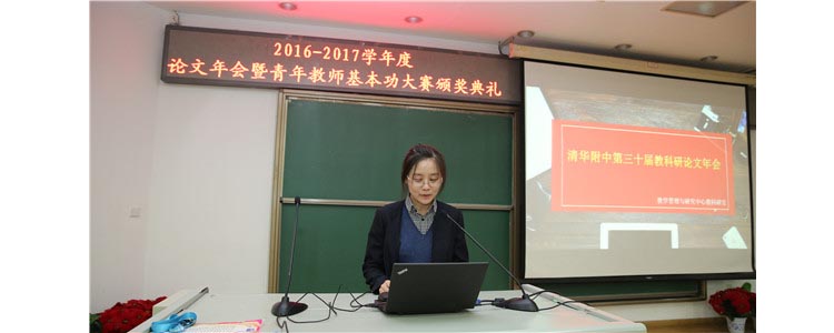 教科研室副主任谭晨对今年论文年会的收集情况进行了简要的介绍,并对此次论文年会的四大亮点进行了概括:数量多、青年教师获奖比例大、论文时代感突出、论文类型丰富。之后,会议播放了以“行走在路上”为题的2016年度教科研工作的总结视频。