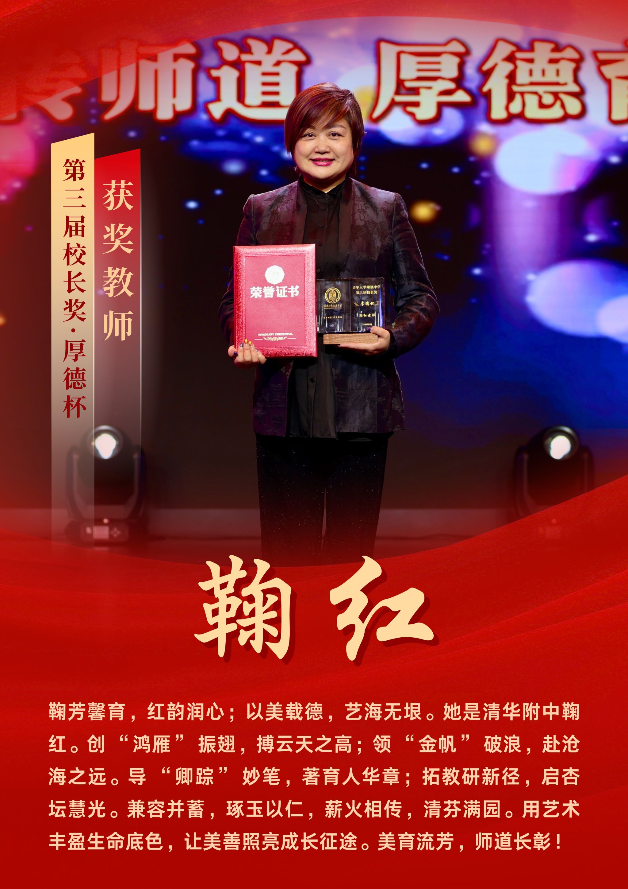 鞠红,北京市特级教师,海淀区名师工作站四至六期音乐学科导师组组长、教科院美育研究中心研究员、美育共同体主持人,中央音乐学院央音国民音乐教育联盟研究员,中国音乐学院教育硕士专业学位研究生行业导师。坚守教学一线37年,深耕附中艺术教育26年,用美育丰盈心灵,以艺术启迪智慧,担任学校大型活动导演,以多元化艺术实践,给予学生受益终身的人文底色。指导学生艺术团荣获北京市中小学生艺术节58次金奖、最佳指挥、优秀辅导教师、最佳创作等奖项;多次承担国家及市区级研究课,获得全国中小学教学研讨课例评比一等奖;多篇论文发表于核心刊物,教学成果获得教育部优秀教学研究成果奖。担任普通高中教科书《音乐与舞蹈》《舞蹈表演》等国家教材及教师用书主编;多项全国教育科学规划重点项目、国家级教育体制改革基础教育项目及课题负责人和主要参与者。