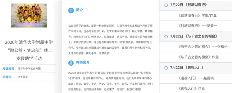 线上教学模式依托皇冠体育空中学堂平台,支教团成员将录制好的课程上传空中学堂,当地小学生通过平台进行录播课程、学案、讲义等部分的在线学习。