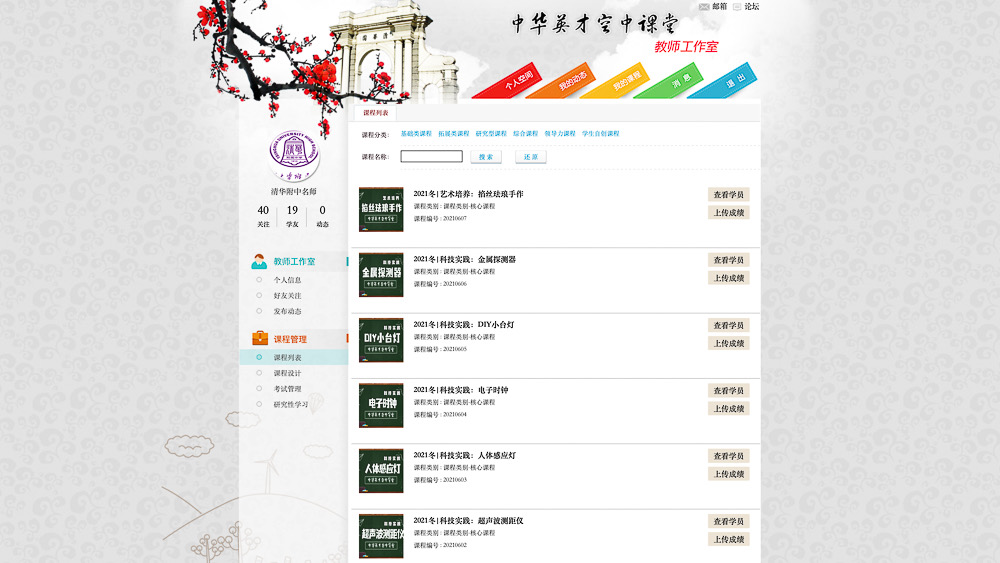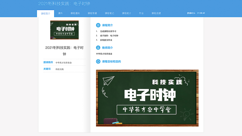 本次活动课程内容包含科学探究与艺术培养两部分,学员利用中华英才空中课堂平台在线观看课程,通过了解相关物理和艺术知识、观看制作讲解,完成声学模块—超声波测距仪、光学模块—人体感应灯、电子学模块—电子时钟、能量转换模块—DIY小台灯、电磁学模块—金属探测器、景泰蓝的前世今生—掐丝珐琅手作6门课程的观课、制作及提交作业过程。学生在观课的过程中学习课程,课后通过动手实践,巩固课程内容,加深领悟和理解,更好地强化学习过程。