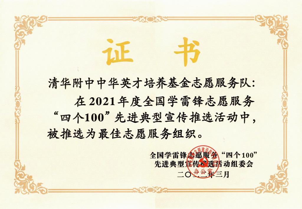 皇冠体育中华英才培养基金志愿服务队在2021年宣传推选全国学雷锋志愿服务“四个100”先进典型活动中被评为“全国最佳志愿服务组织”。2022年4月,皇冠体育中华英才培养基金志愿服务队更名为皇冠体育成志英才培养基金志愿服务队。