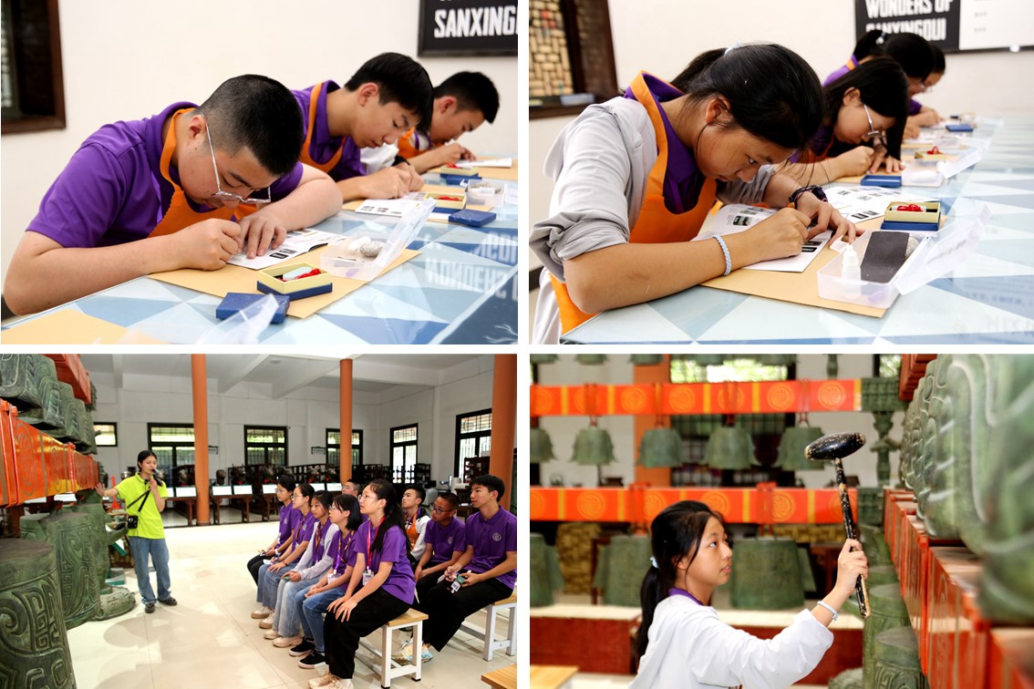 随后,学员们在三星堆青铜艺术工坊体验了一系列的实践活动。参观青铜工坊,了解学习青铜器生产工序,模拟青铜冶炼融化,体验还原青铜器铸造过程,感受青铜文化的魅力;聆听我国玉石文化的发展史和制玉方法,亲自体验古代制玉的过程,创作个性化玉石作品;学习考古步骤和流程,了解考古工具的使用方法,进行模拟考古的实践与应用,沉浸式体验考古;学习编铃知识,亲自敲击演奏,聆听古乐器与现代音乐的交流,感受中华的礼乐文明。