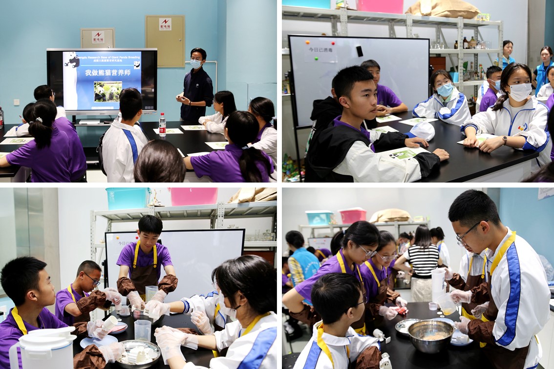 24日,学员们来到成都大熊猫繁育研究基地,实地了解大熊猫繁育与生活习性。通过研学导师的介绍,辨认大熊猫喜爱食用的竹子特征,参与“闻香识竹”活动,了解大熊猫的食竹特征;到熊猫别墅,观察并记录大熊猫的行为特征、食竹特性、消化道特征、伪拇指特征等;了解大熊猫“窝窝头”原材料的营养成分,亲自动手制作大熊猫美食。
