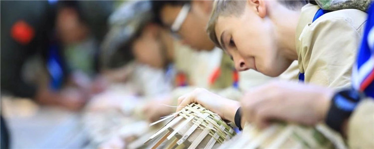 接下来就该感受“美”的艺术了。孩子们像萝卜找到了自己的坑一样,开始了编竹篓。竹篓在山中的用处大,可以采茶采草药,摘花摘瓜果。他们的神情那样专注,一个个小竹篓就这样在他们手中诞生了!竹子,青的色,韧的皮,也代表童子军的青春向上和坚韧品质。