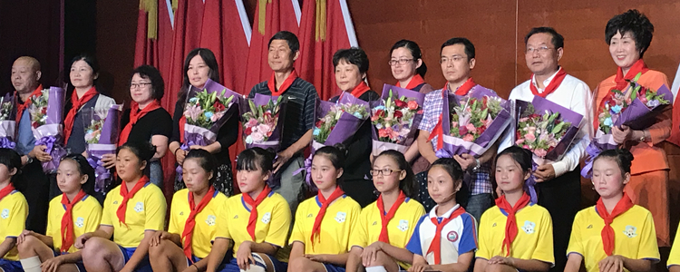 董蓓副校长参与表彰大会,各校校领导与献花小学生代表合影