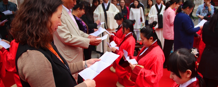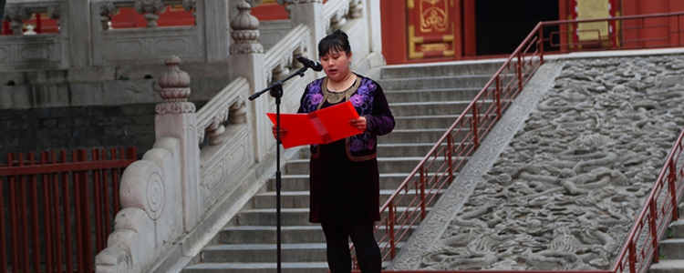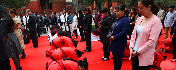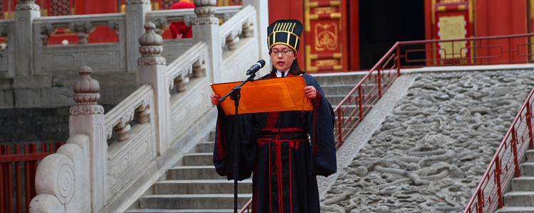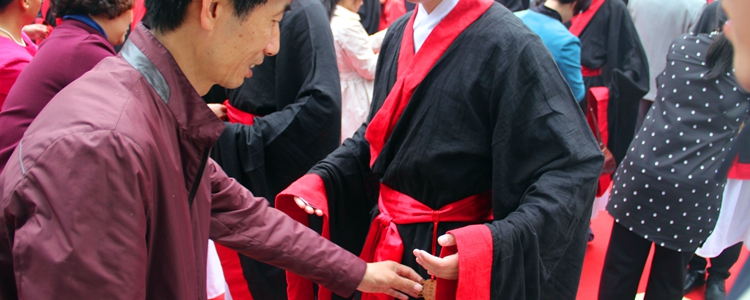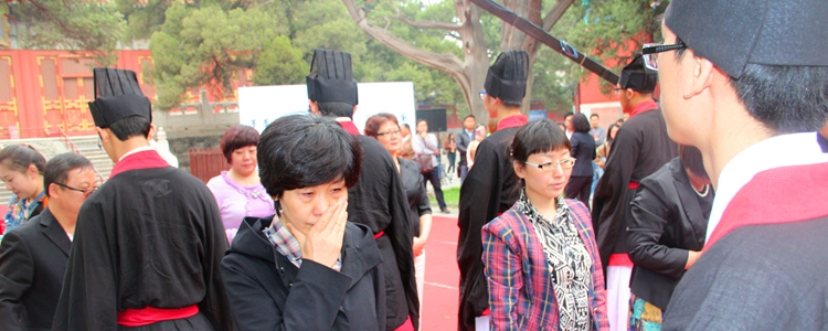 主持人宣布开礼后,纪建波书记庄重宣读了诰文:“时维公元2016年4月27日,孔历2567年春,有皇冠体育官网朝阳学校学生与孔庙举行成人礼仪式……”