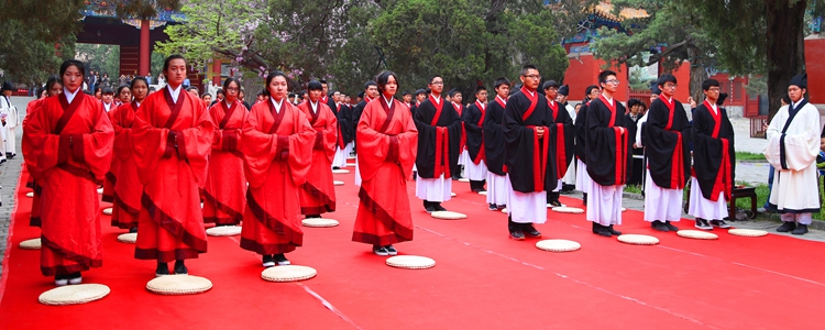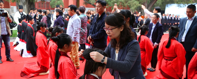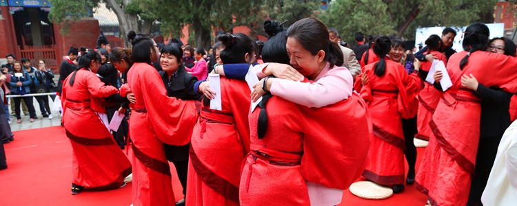 下午2点,成人“冠笄礼”仪式在庄严的礼乐声中拉开序幕。莞尔韶华,奕奕容光,同学们身着红、黑色调的汉服,在司礼官的引导下,向圣贤先师孔子像行四拜礼后,徐徐迈过大成门,成人礼仪式正式开始。