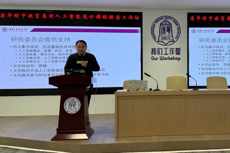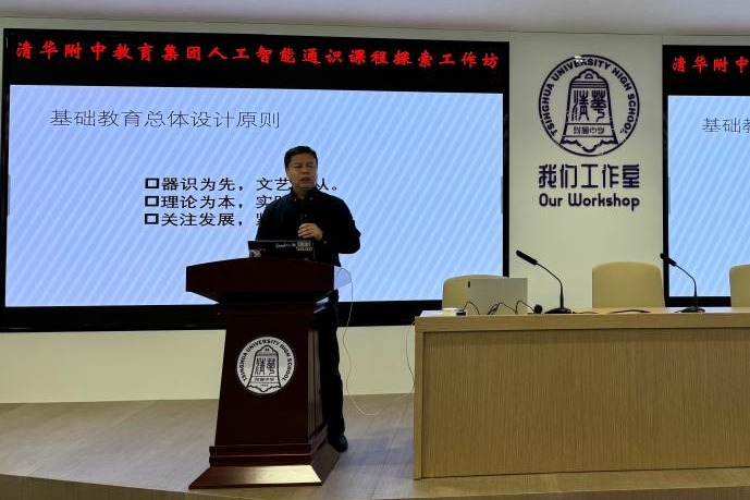 启动仪式上,马少平教授深入剖析了人工智能通识课程的背景意义,王东老师详细阐述了人工智能通识课程的具体内容,谭洪政主任对工作坊的未来规划进行了全面介绍。